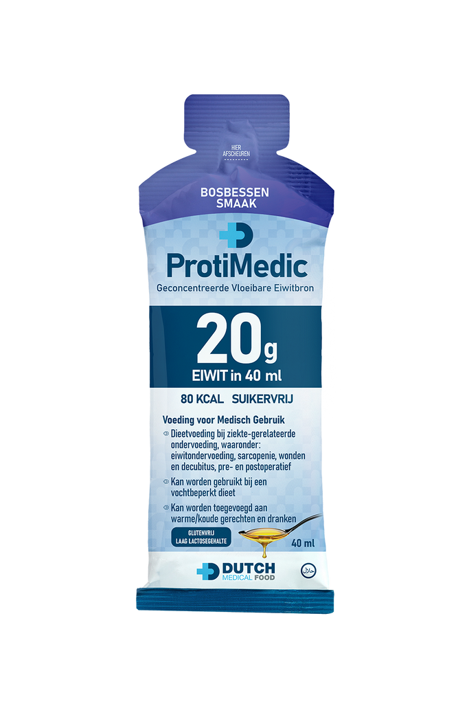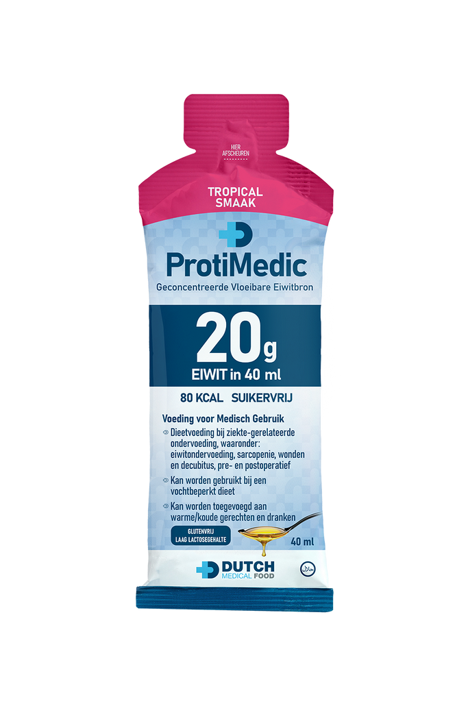 ProtiMedic is a highly concentrated protein source (20g protein in 40ml), designed to be mixed with hot/cold meals and/or snacks. It serves as a Food for Special Medical Purposes and can be used for the dietary management of patients suffering from protein malnourishment.